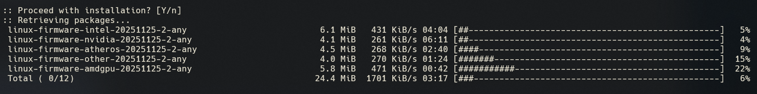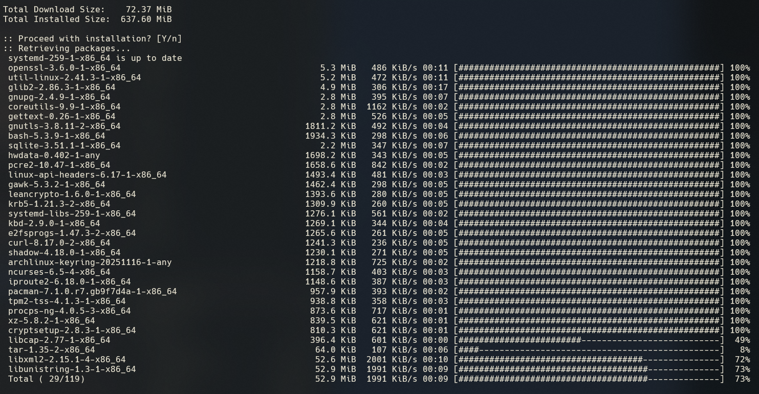 arch-chroot /mnt 165.51s user 134.30s system 3% cpu 2:13:36.05 total