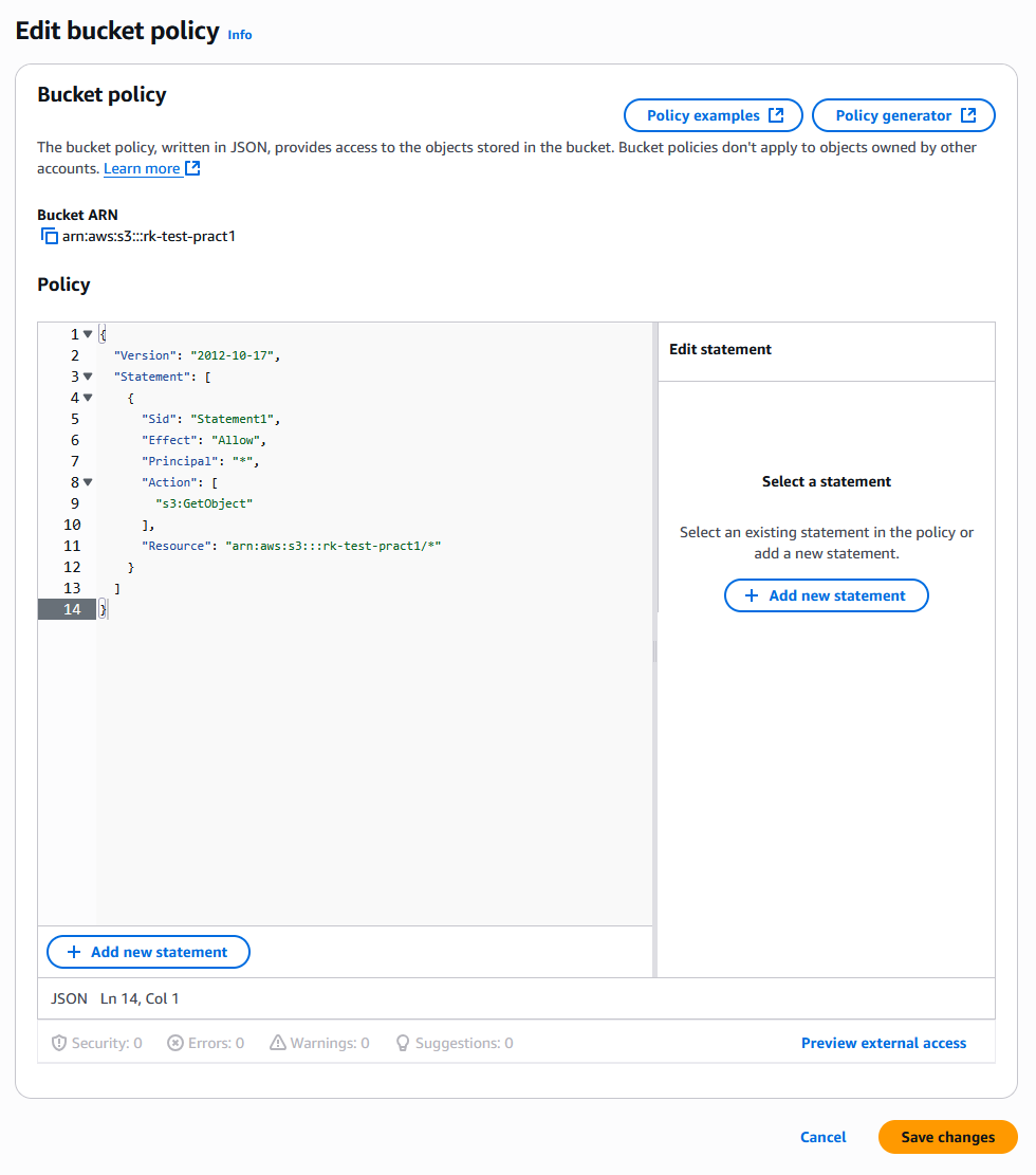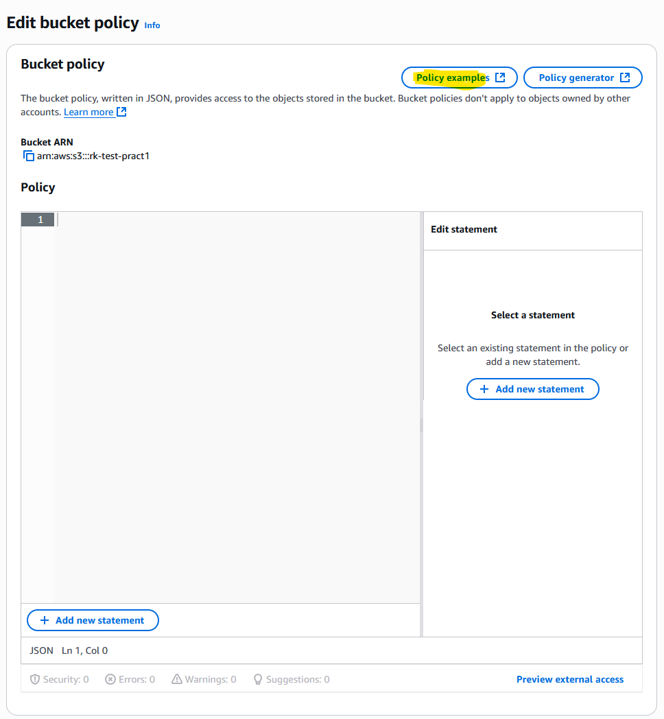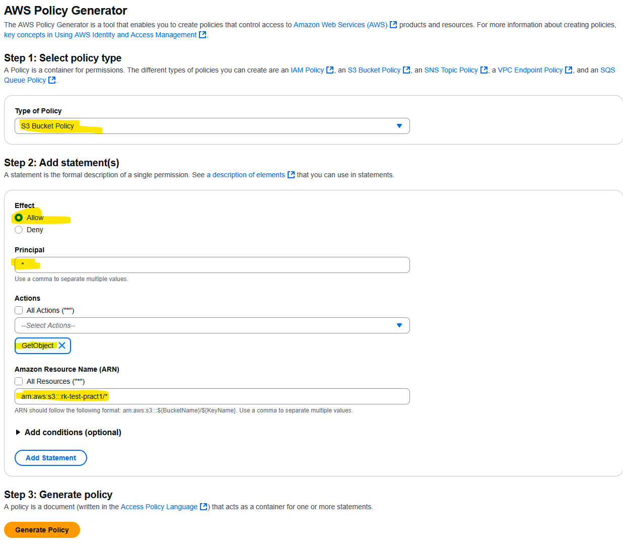 Edit Bucket policy (follow Policy examples OR Policy Generator)