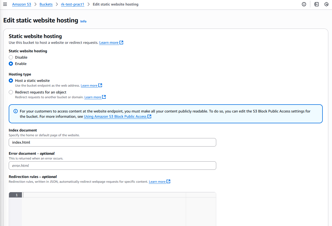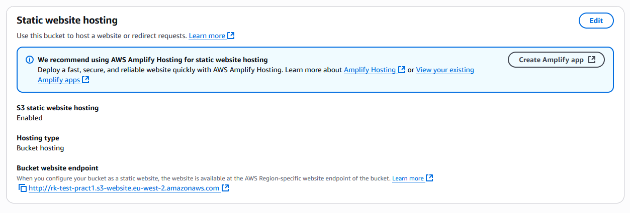 S3 > General purpose buckets (or other) > your-bucket > Properties > Static website hosting
