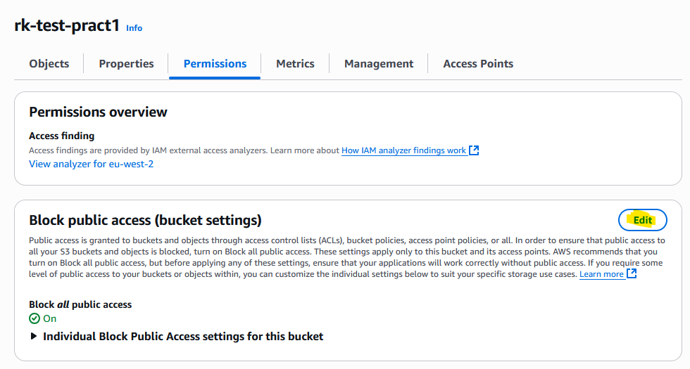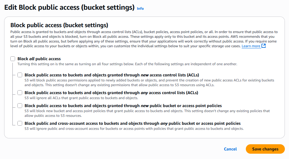 S3 > General purpose buckets (or other) > your-bucket > Permissions > Ensure Allow public access is enabled
