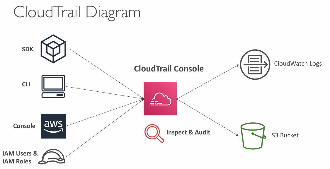 Logs from CloudTrail can be stored in CloudWatch Logs or S3. Trail can be applied to All Regions (default) or a single region.