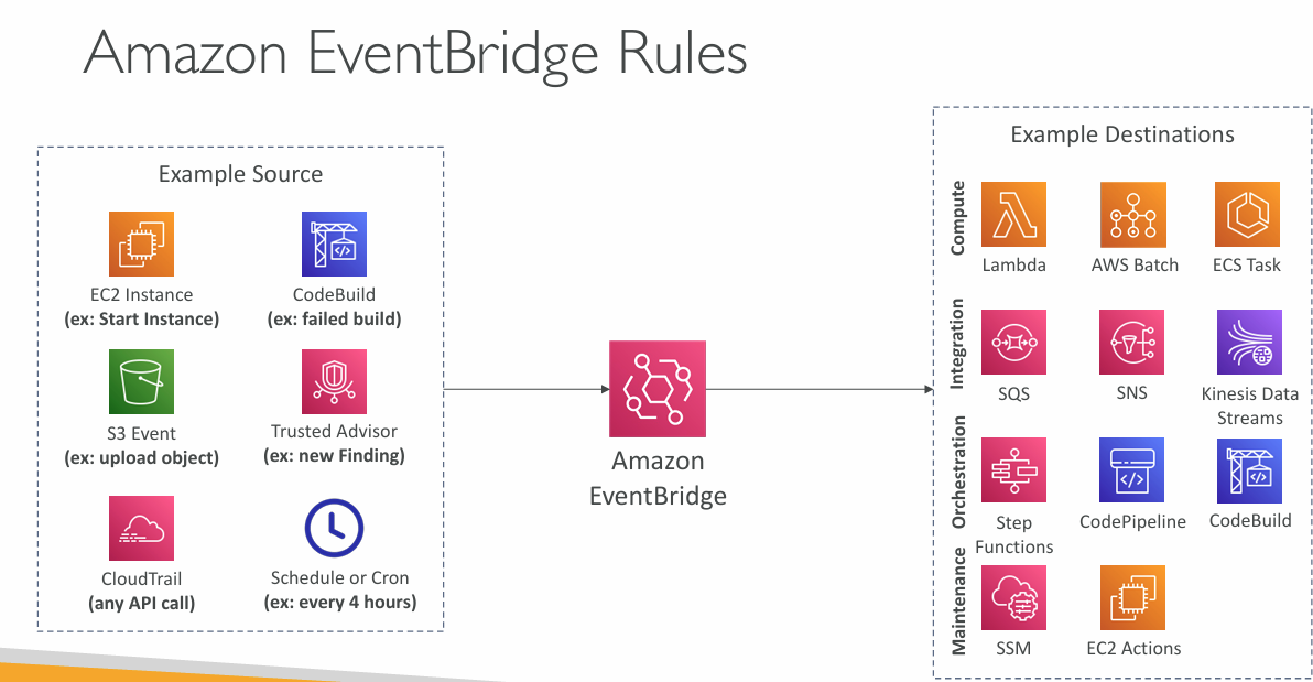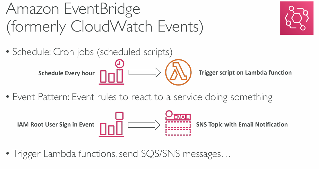 - Events (EventBridge) - react to events in AWS or trigger a rule on a schedule