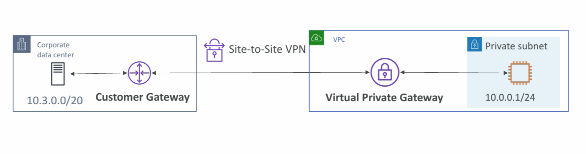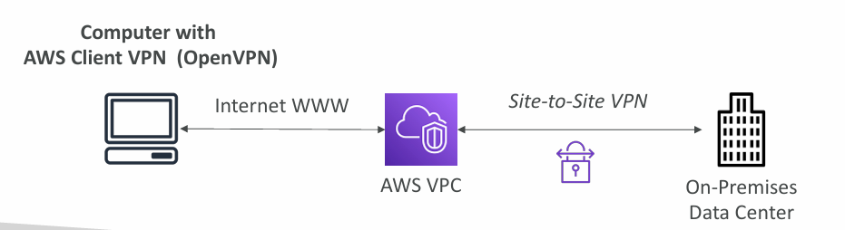 - Site to Site VPN: VPN over public internet between on-premises DC and AWS