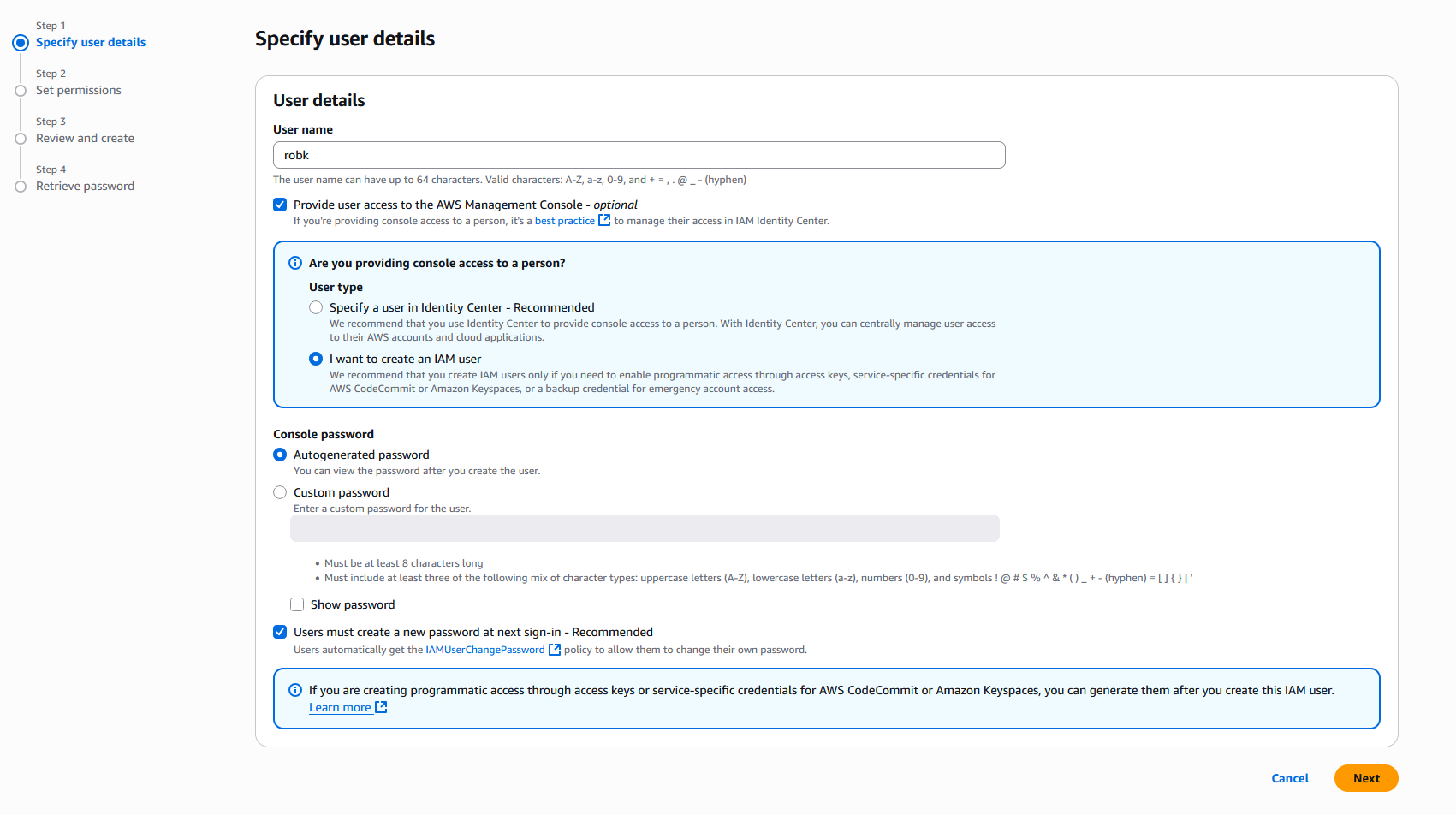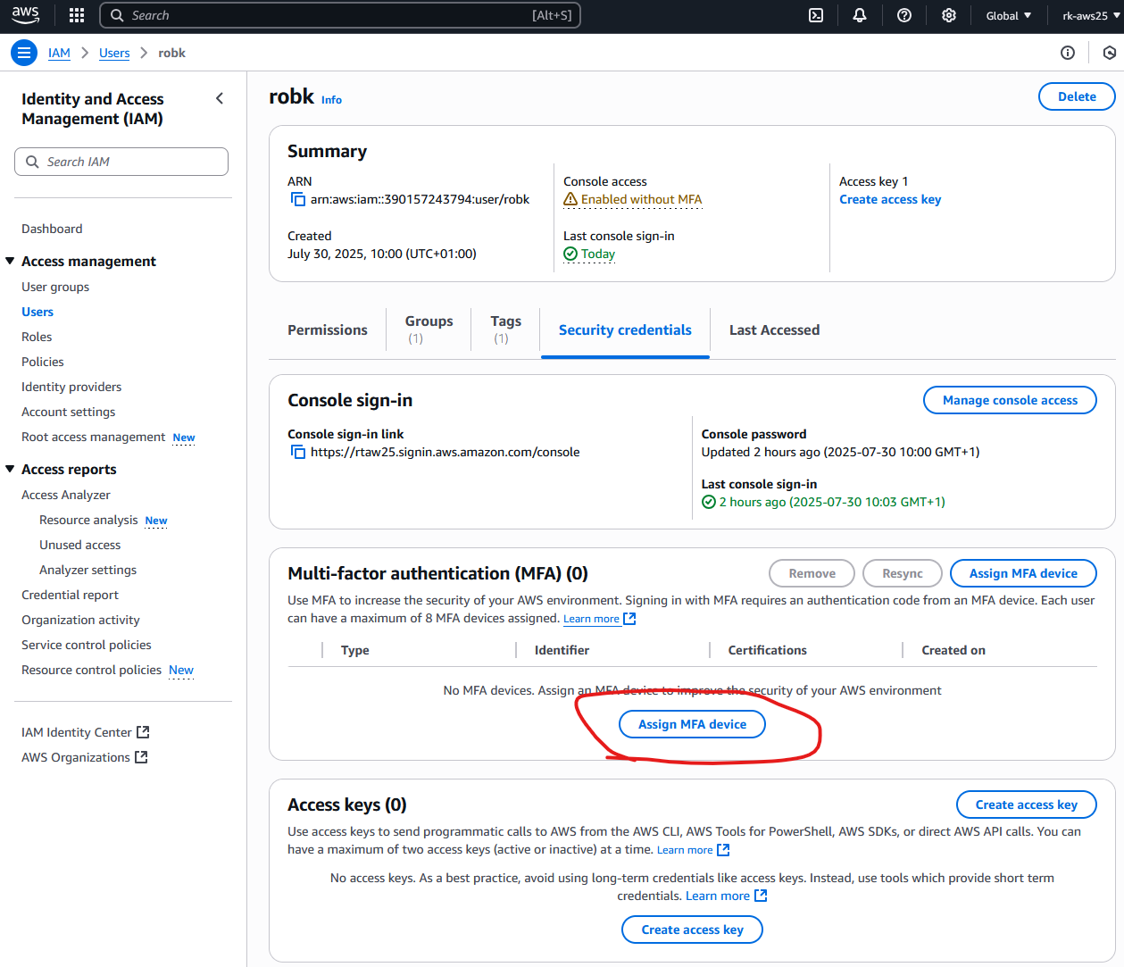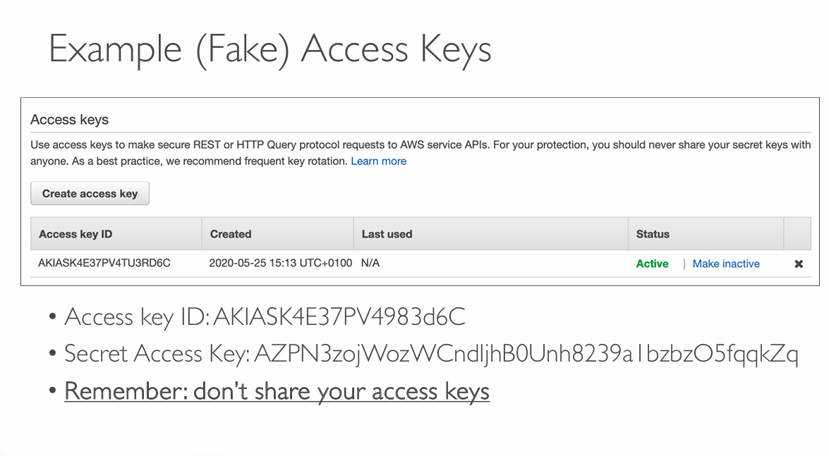 - Use Access Keys for Programmatic access (CLI / SDK)
