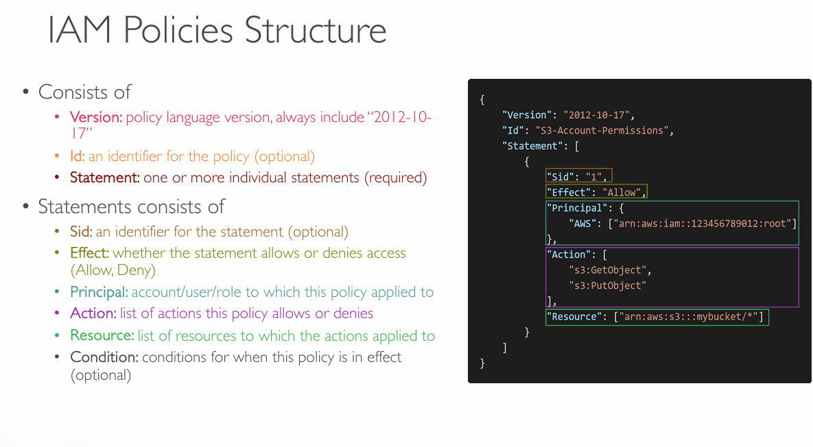 Users or Groups can have assigned JSON documents called policies. Those policies define permissions for the users / groups.