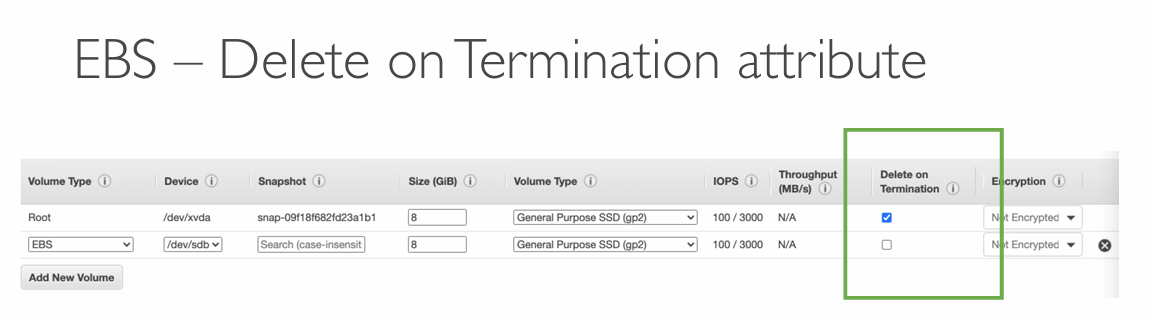 - by default any other attached EBS volume is not deleted (attribute disabled)