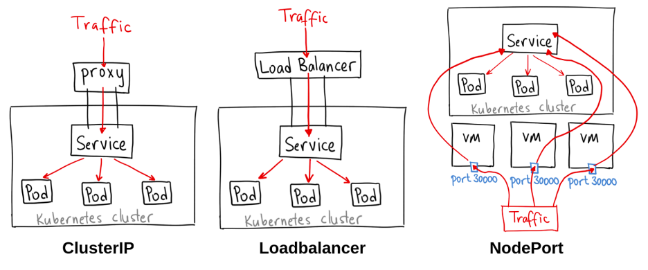 nodePortoutside of the Kubernete cluster. Kubernetes control plane allocates a port from a range specified by--service-node-port-range. - LoadBalancer - exposes the Service externally using a load blancer, which directs traffic from a