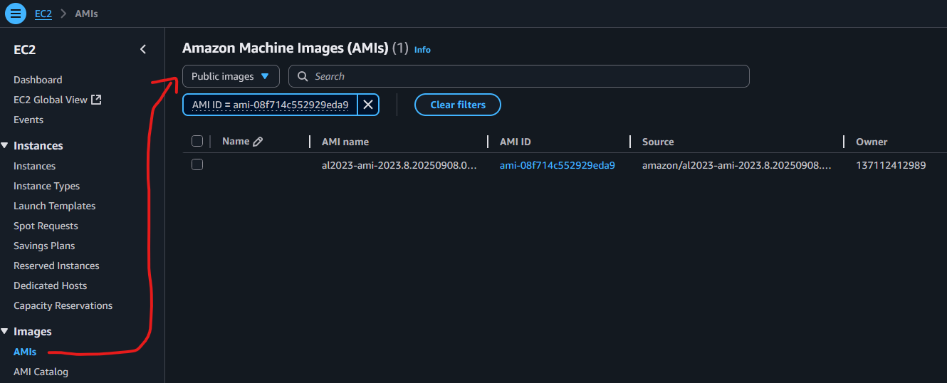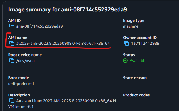 💡 Finding AMI for filter value values = ["al2023-ami-*-x86_64"]: