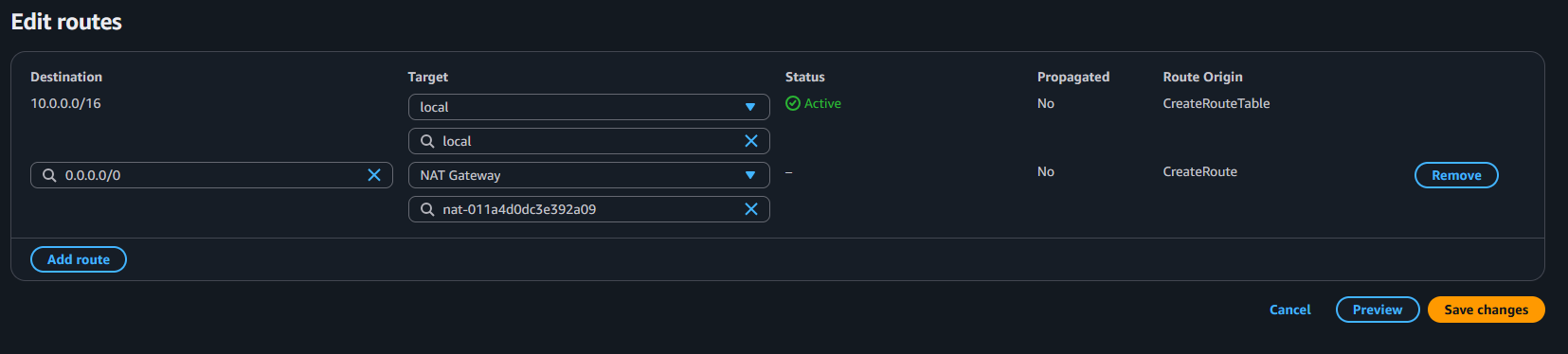 IAM console > VPC > Route tables > my-private-route-table > Routes