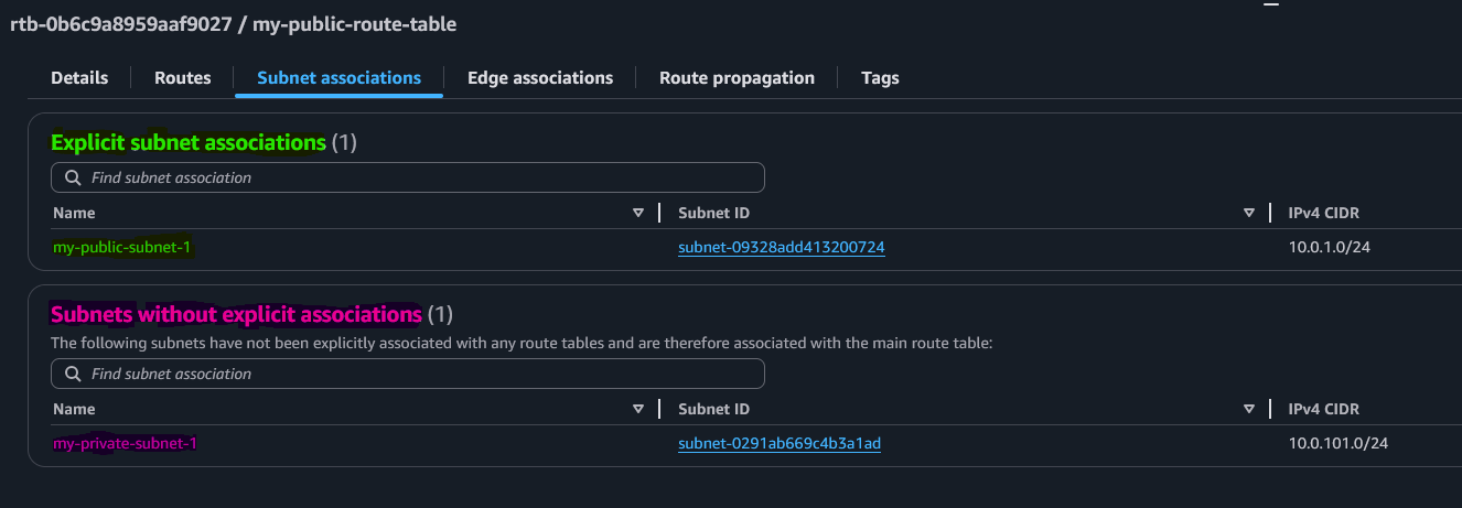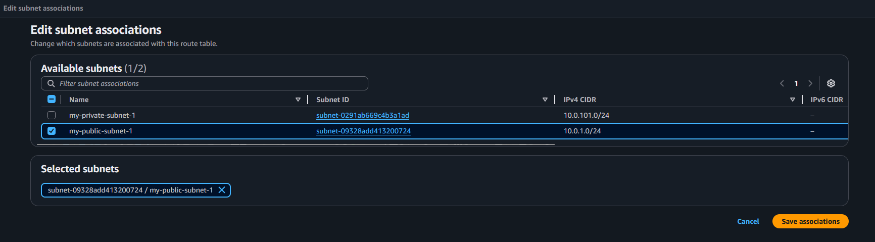 IAM console > VPC > Route tables > my-public-route-table > Subnet associations > Explicit subnet associations